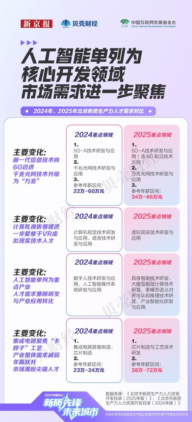 新京报贝壳财经记者发现✿✿★✿,与2024年相比✿✿★✿,今年《目录》核心开发领域从60个精简至58个✿✿★✿,人工智能从新一代信息技术中独立成列✿✿★✿;同时✿✿★✿,“专家”一词出现频次由28次增至31次✿✿★✿,参考年薪区间整体上移✿✿★✿。这些变化释放出明确信号——北京的人才需求正进一步向尖端人才聚焦✿✿★✿。