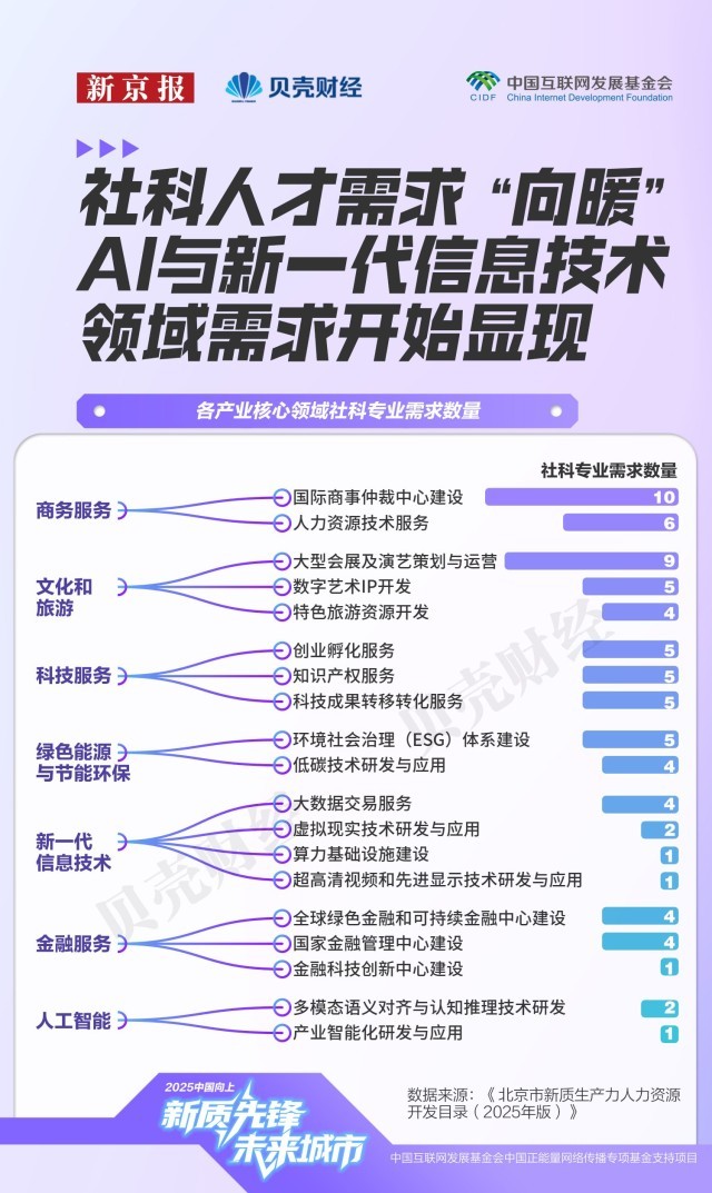 新质生产力带来的复合型人才需求✿✿★✿,为社科专业创造了新的市场空间✿✿★✿。《目录》显示✿✿★✿,社科类人才虽主要集中在商务服务✿✿★✿、文化旅游和科技服务等服务业领域✿✿★✿,但需求已延伸至人工智能✿✿★✿、新一代信息技术等核心科技产业✿✿★✿。